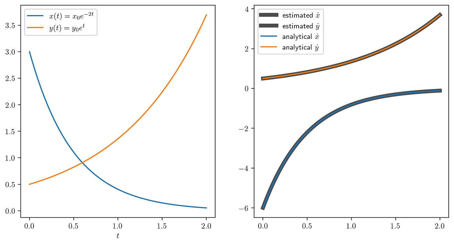 The analytical gradient of these equations is very straightforward (see the equations below). We will validate the dynamical system identified by SINDy with these analytical equations.