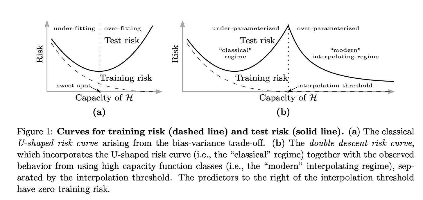 In “Reconciling modern machine learning practice and the bias-variance trade-off,” Belkin et al. detail the phenomenon of double descent. This phenomenon states that if we keep increasing the model’s complexity beyond a certain point, the testing risk reduces. The figure above from their paper does a great job illustrating this. This observation goes against one of the fundamental concepts that we learn in introductory machine learning courses: a complex model does not generalize well, and we should aim to find the simplest model that explains the observed data. We learn that a simple model, or the "Occam's razor" model, is the one with the least model complexity. In this paper, they demonstrate that double descent is observed in Random Forests and Feed-Forward Neural Networks, and increasing the complexity of the model improved its generalizability as well.