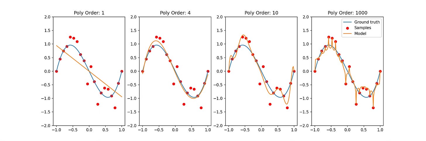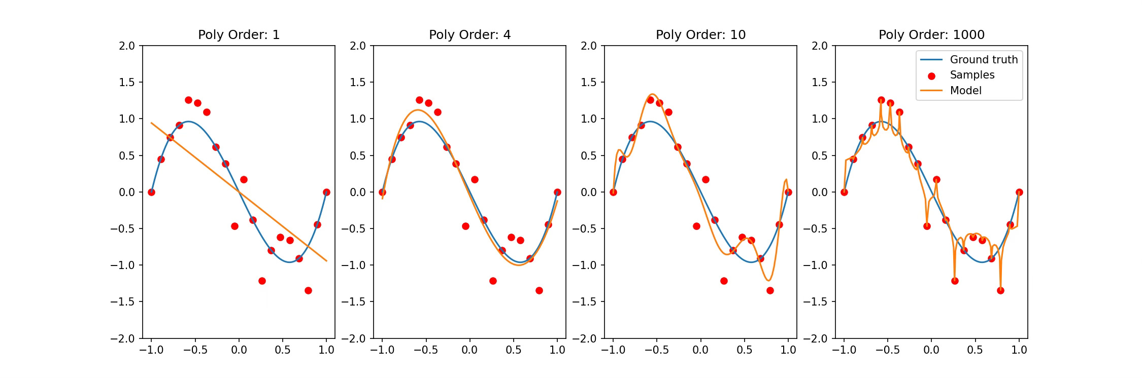 Consider a simple problem of polynomial fit. We learn that by increasing the order of the polynomial beyond a certain point, our model will overfit and the testing error will increase. However, if we keep increasing the model complexity, as seen in the figure below, we notice that the fit does get better. Rather than a smooth approximation in lower-order polynomials, higher-order polynomials tend to capture the dynamics of the observed data better. The code used for generating this figure is available here.